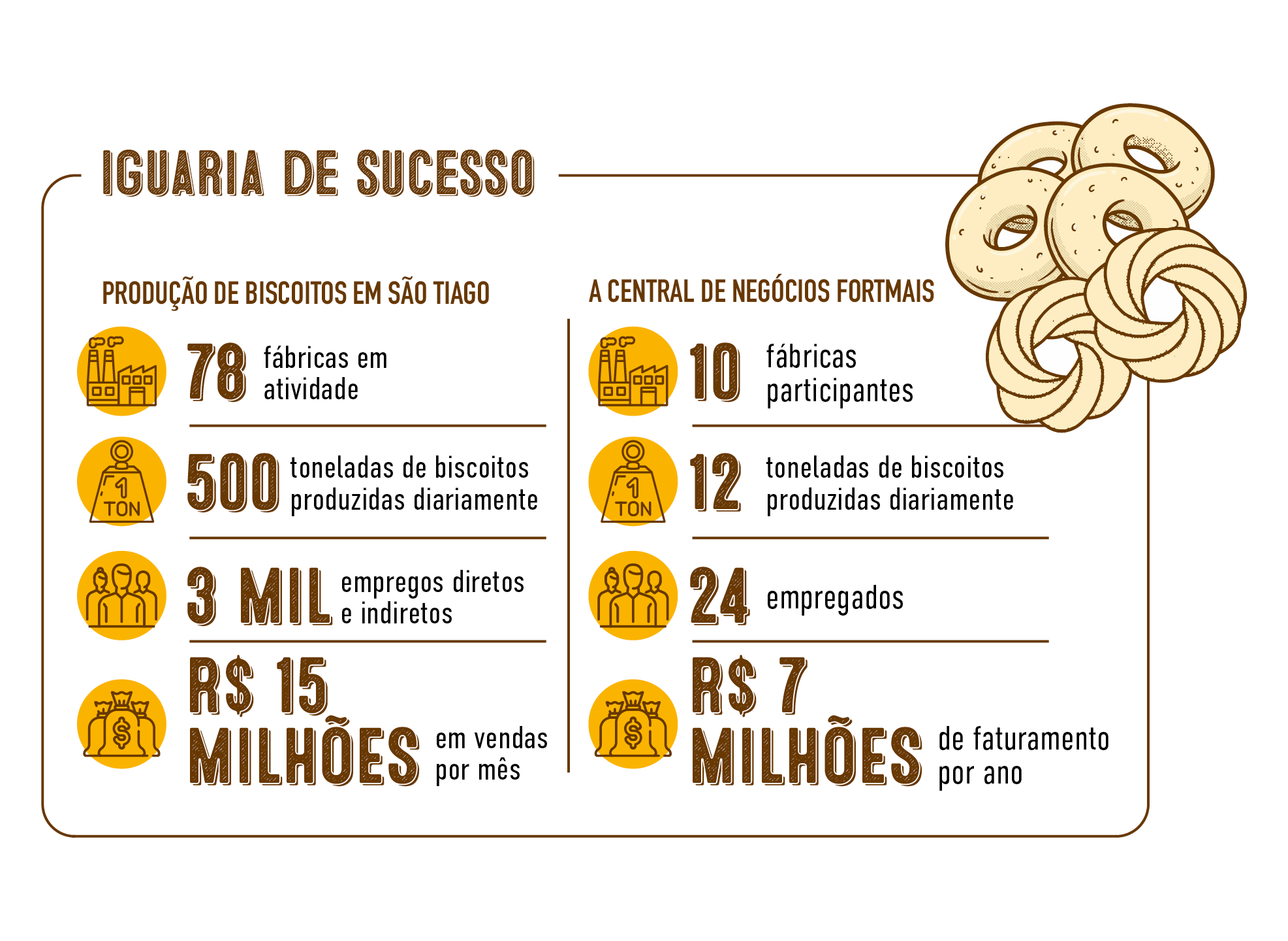 A entrada da empresa na Fortmais pavimentou um novo ciclo de crescimento, que permitiu o aprimoramento do trabalho em conjunto com outros empreendedores. “Com a ajuda do Sebrae, nós, sócios da Fortmais, estamos sempre fazendo cursos e participando de feiras. Hoje, por meio da Central, conseguimos fazer compras em conjunto com melhores preços e estamos mais fortalecidos.” Atualmente, a Biscoitos tem 23 empregados, fornece para estados como São Paulo e Rio de Janeiro e tem pretensões de, no futuro, investir em mecanização, como forma de solucionar o desafio da mão de obra.