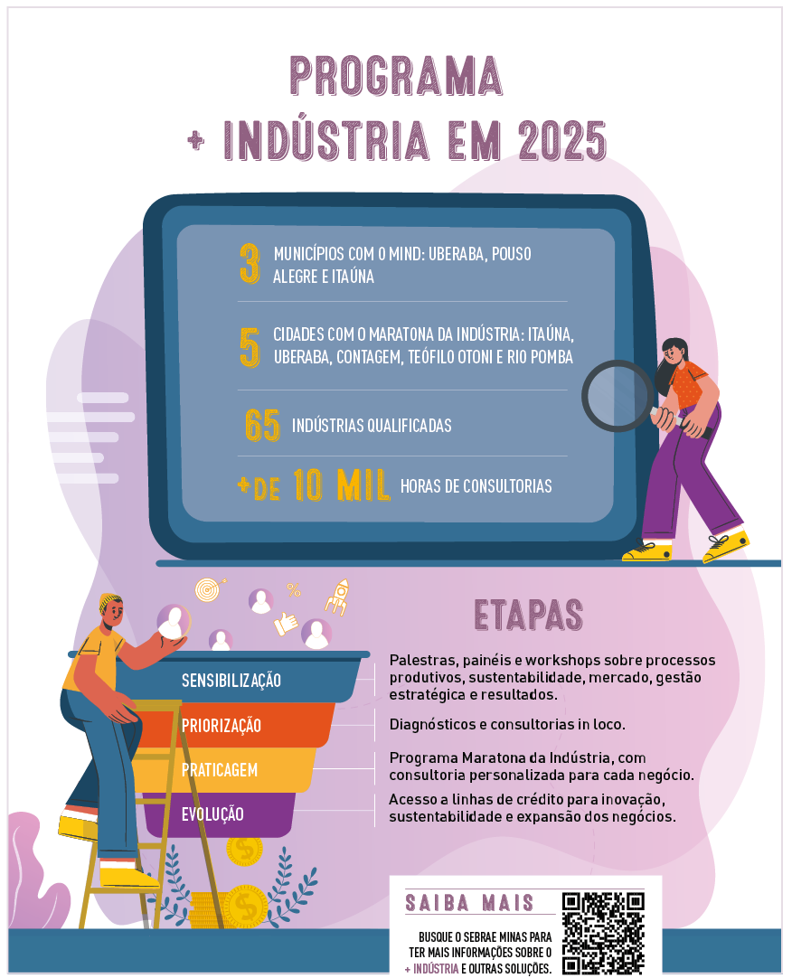 O analista do Sebrae Minas Diogo Dias Lisboa avalia que, até o momento, a jornada do + Indústria sinaliza que a estratégia de intervenção vem cumprindo o papel de acelerar e impulsionar a transformação nos pequenos negócios industriais. “No primeiro ano, foi desenvolvida toda a estratégia que orienta o trabalho atual. No segundo ano, realizamos ações-piloto importantes. Agora, o ano de 2025 marca a consolidação e afirmação da estratégia, com foco na expansão do + Indústria para outras regiões do estado”, explica.