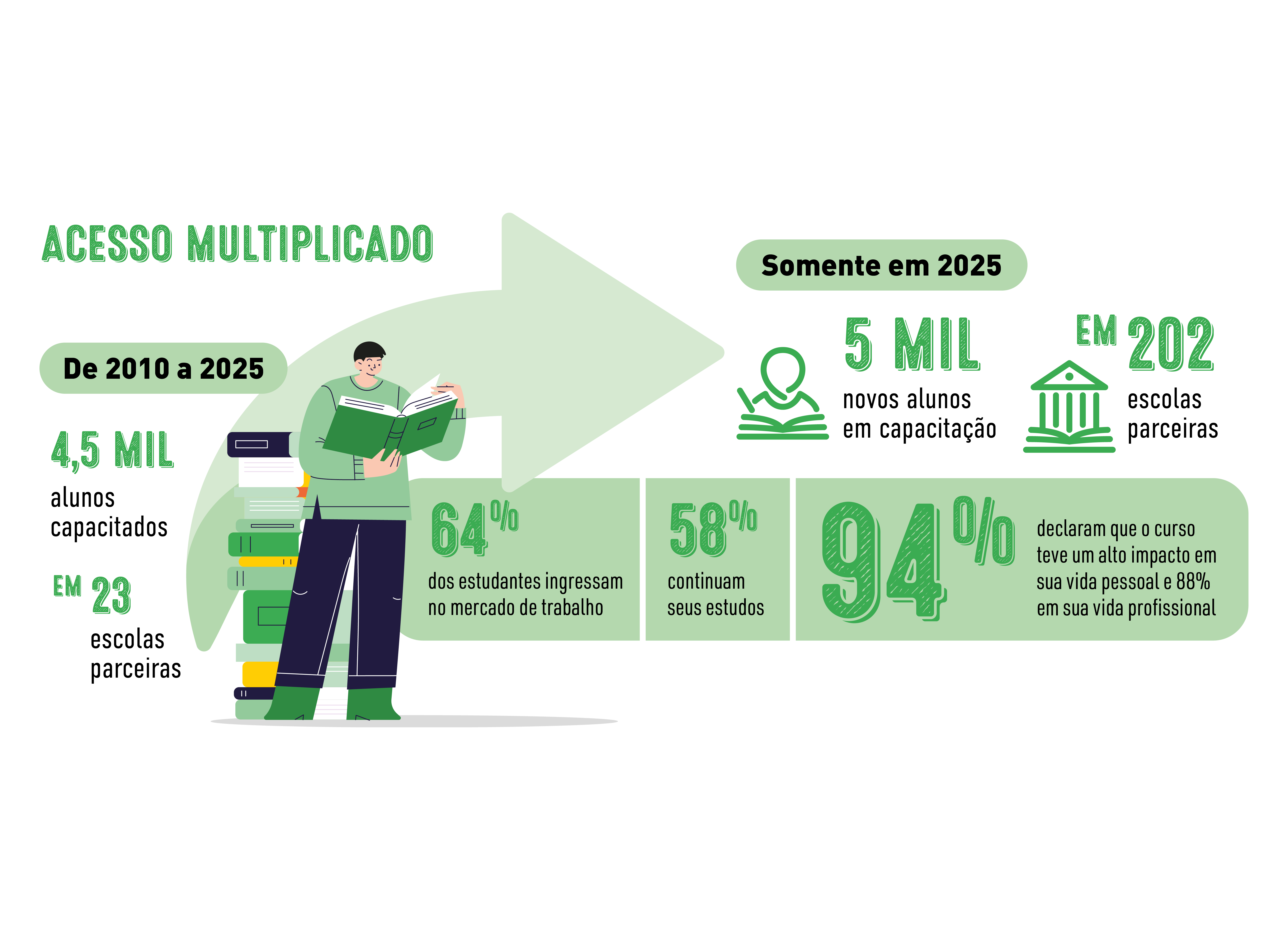 No primeiro semestre de 2025, 5 mil novas vagas foram disponibilizadas no Curso Técnico de Administração oferecido pelo Sistema de Ensino da Escola do Sebrae. As oportunidades foram criadas por meio da parceria entre a Escola do Sebrae e os governos de Minas Gerais e de Roraima, que possibilitou um crescimento exponencial do número de instituições que ofertam o curso técnico: um salto de 23 para 202 escolas públicas.